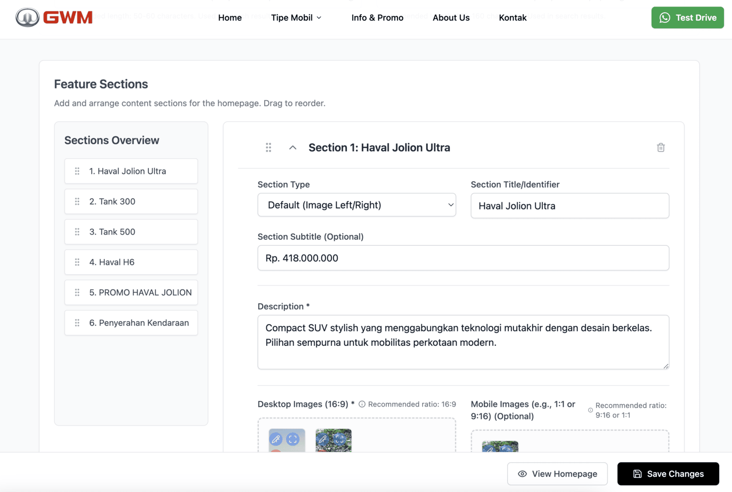 The homepage’s dynamic sections required a flexible database schema. Using Drizzle ORM with SQLite, I designed a homepage_feature_sections table to support various section types (e.g., feature sliders, banners) with a polymorphic design. The section_type field (e.g., ‘default’, ‘feature_cards_grid’) determines the section’s purpose, while type_specific_data (stored as JSON) holds configuration unique to each type. Additional fields like desktop_image_urls, mobile_image_urls, features, and button links (e.g., primary_button_link) enable rich customization. This structure allows users to add, reorder, and edit sections via the drag-and-drop interface without schema changes, though optimizing JSON parsing and query performance for complex sections remains a challenge.